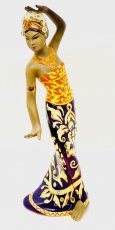 Dressed up in a batik colourful dress with gold gilt detail and moving in a traditional dance beautifully executed.