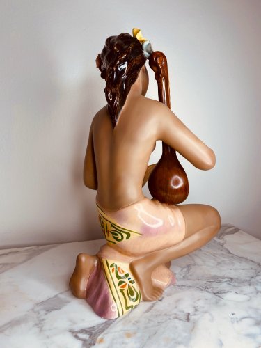 This ceramic figure is a REAL statment piece standing at 50cm tall ,a true beauty and the detail has to be seen in the hand painted dress and the hand made flowers together with the musucal instument she is playing .
